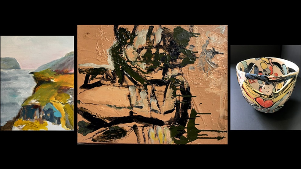 Hier sind Gemälde und Keramiken der drei lokalen Künstlerinnen und Künstler zu sehen: Berghild Lamhauge Holst, Gunhild Bloch und Jes Mogensen.