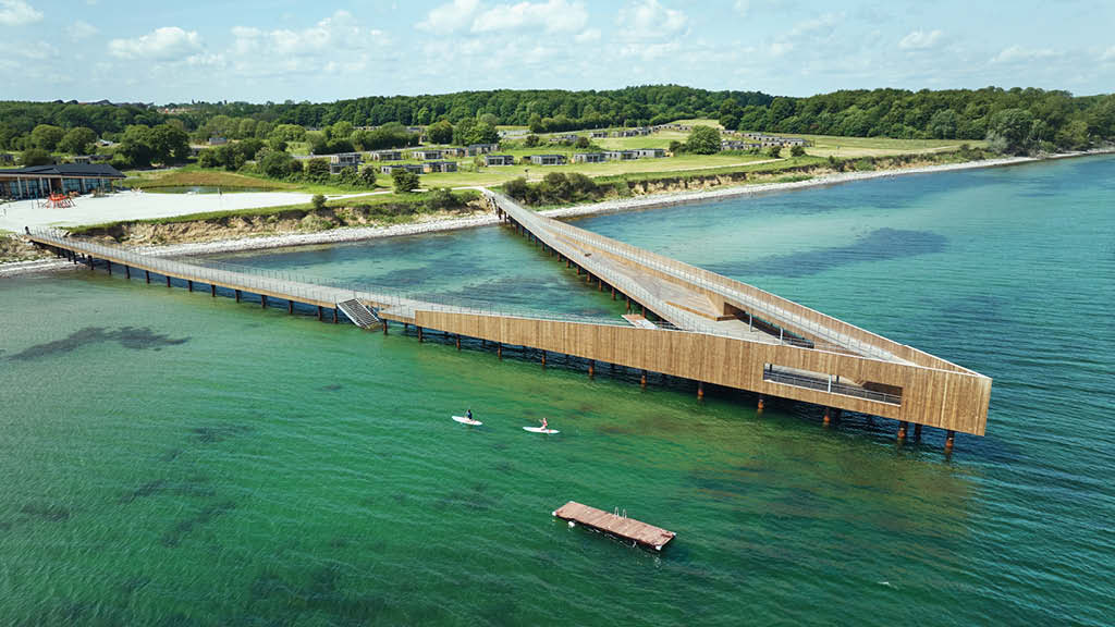 Die 310 Meter lange Seebrücke ist mit Frøslev Abodo-Holz verkleidet, das mit der Zeit einen silbergrauen Farbton annimmt.